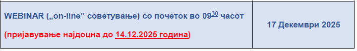 Ве информираме дека ЕУРО КОНСАЛТ ПЛУС, организира советување – КПУ Бр.5/2025 – 8 КПУ часа во месец ДЕКЕМВРИ 2025 година, со следниот распоред: